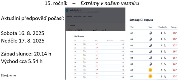 Po přivítání od Alenky se slova ujala Dáša, která jako vždy spatra zmínila všechny nejdůležitější informace k organizaci (pásky, Pepu s helmou, zaměření akce na pozorování hvězd, nikoliv malechovický Oktoberfest, i když stan máme taky; zejména bylo zdůrazněno doporučení projít si okolí stanu a zorientovat se ještě za světla) a poděkovala již tradičnímu pořadatelskému týmu. Nakonec i Pavel poděkoval partnerům MB hvězdárny, svým spolupracovníkům a uvedl program celé akce včetně letošního tématu Extrémy ve vesmíru. Přitom neopomněl okomentovat aktuální předpověď počasí (viz obr. 2). V odpovědi na otázku holčičky: „Jaké hvězdy uvidíme?“, Pavel mimo jiné zaregistroval v protějším vchodu do stanu oranžový kotouč zapadajícího slunce, proto zájemce pozval na poslední možnost prohlédnout si jeho povrch i romantický západ.