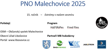 Prázdninová slavnost – PNO v Malechovicích získává letos občanský průkaz. Když před lety přišel Míra Vaněk s nápadem uspořádat zde, na Novákově kopci, setkání a pozorování s profesionálním hvězdářem Pavlem Bromem z mladoboleslavské hvězdárny, byla jsem nadšena. A nejen já. Vstříc nápadu vyšli velkoryse manželé Dáša a František Kozderkovi. Zaujalo to i celoživotního příznivce astronomie, mého manžela Pavla. Postupně se sousedská sešlost změnila na velkou prázdninovou akci přesahující možnosti nás, pár organizátorů. Jsem ráda, že navzdory řadě problémů, které zákonitě podobné akce provázejí, koná se pozorování i letos. Dovolte mně proto, abych Vás jako předsedkyně OSM přivítala. Nejlépe básní Josefa Brože. (Recitace básně Malechovice.)