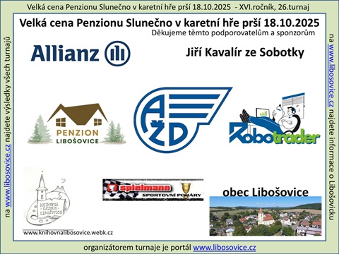 Termín jarního turnaje XVII.ročníku Mistrovství Českého ráje, celkově 27.turnaje, je naplánován na 14.3.26 v Hotelu Český ráj v Libošovicích. Libošovice leží na trati 064, takže jsou dosažitelné vlakem. Ubytování je možné v Penzionu Libošovice, při rezervaci hlaste heslo PRŠÍ.